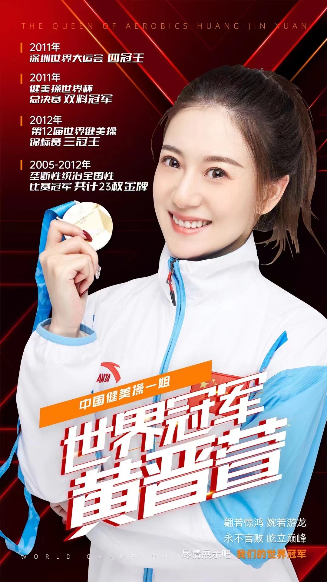 黃晉萱,1988年4月21日生于遼寧沈陽(yáng),國際級運動(dòng)健將健美操世界冠軍,黃晉萱是國家健美操隊唯一的女隊員,也是國內健美操屆唯一的女冠軍。在第26屆世界大學(xué)生運動(dòng)會(huì )上獲得四項冠軍。