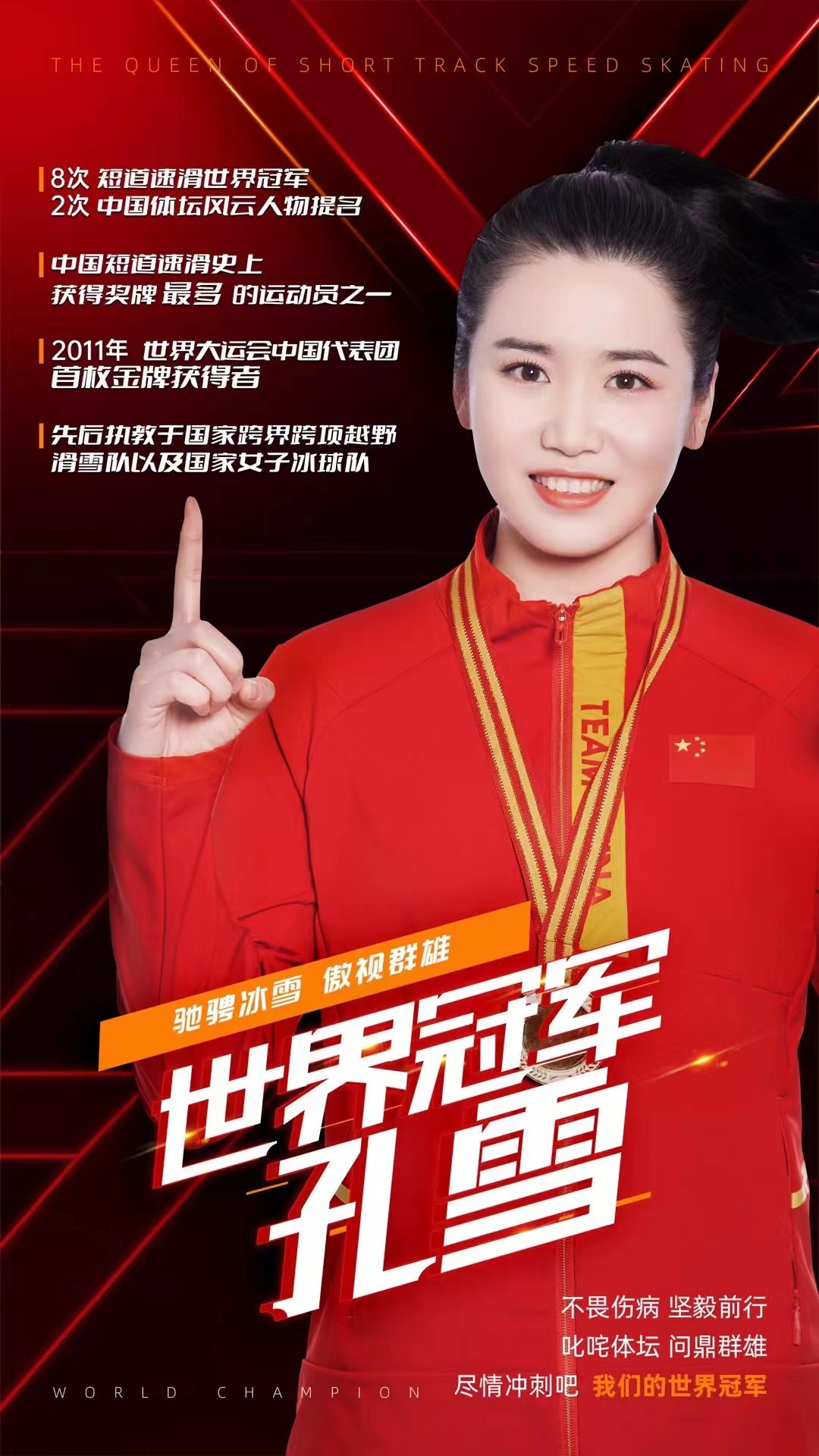 孔雪,女,1991年8月26日出生于吉林省吉林市,短道速滑世界冠軍,2012—2013年獲得過(guò)2枚世錦賽金牌,獲得2012年和2014年體壇風(fēng)云人物提名,擔任過(guò)跨界跨項越野滑雪隊教練員,及國家女子冰球隊滑行教練員。北京體育大學(xué)研究生畢業(yè)。目前是教練,公益形象大使。 中國女子短道速滑運動(dòng)員,效力于新疆隊。